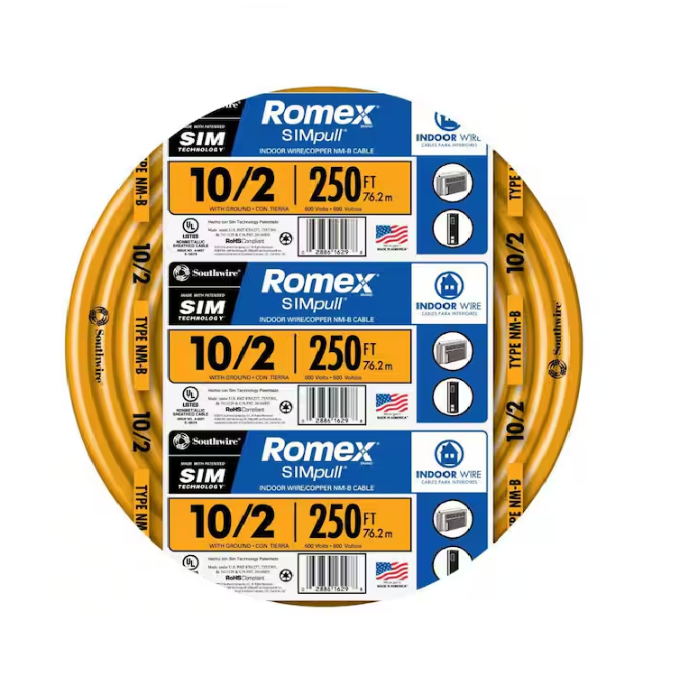 10/2 Solid Romex SIMpull CU NM-B W/G 电线#10 AWG 住宅用电线,用于插座、开关和其他负载 铜 (CU) 导体 10 号规格具有橙色编码护套,用于识别尺寸10/2 Solid Romex SIMpull CU NM-B W/G 电线 -