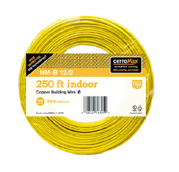 12/2 Yellow Solid CerroMax SLiPWire Copper NM-B 电线12 号室内电线,适用于住宅 可用于高达 20 安培的插座和开关 适用于干燥场所12/2 Yellow Solid CerroMax SLiPWire Copper NM-B 电线 -