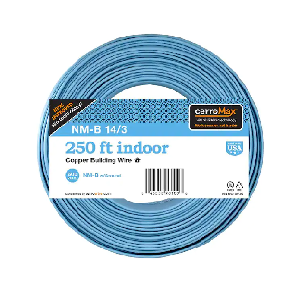 14/3 Light Blue Solid CerroMax SLiPWire Copper NM -B 电线14 号室内电线,适用于住宅 浅蓝色护套,用于识别 14/3 尺寸 可用于高达 15 安培的插座和开关14/3 Light Blue Solid CerroMax SLiPWire Copper NM -B 电线 -