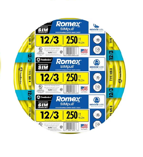 12/3 Solid Romex SIMpull CU NM-B W/G 电线#12 AWG 住宅用电线,用于插座、开关和其他负载 铜 (CU) 导体 250Ft12/3 Solid Romex SIMpull CU NM-B W/G 电线 -